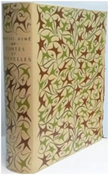 1953Aymé (Marcel). - Contes et nouvelles.Paris, Gallimard, Nrf Edition collective illustrée de 32 aquarelles de Gus Bofa gravées sur bois par G. Angiolini & G. Rougeaux. In-quarto (191 x 230) chagrin ivoire orné de fers spéciaux vert, marron et or, dos lisse avec auteur, titre et date en queue dorés, sigle " Nrf " doré, étui décoré (reliure de l'éditeur d'après la maquette de Paul Bonet). Tirage limité à 10 250 exemplaires numérotés sur vélin Plumex. L'ouvrage contient notamment les " Contes du chat perché ". |