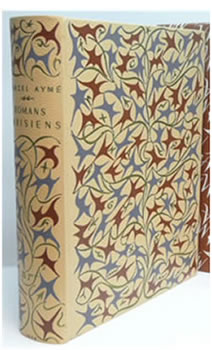 1959Romans parisiens.Paris, NRF 1959, In-quarto (192 X 230) chagrin ivoire orné de fers spéciaux gris bleu, marron et or, dos lisse avec auteur, titre et date en queue dorés, sigle " Nrf " doré, rhodoïd, étui décoré (reliure de l'éditeur d'après la maquette de Paul BONET),820 pages. Tirage limité à 10 250 exemplaires numérotés sur vélin Plumex. 32 aquarelles par Gen Paul (frontispice), Vivancos (5), B. Kelly (5), Demonchy (5), J.-D. Malclès (5), Perraudin (5) et Dechelette (6). Contient : Le Vaurien illustré par Vivancos - Maison Basse illustré par B. Kelly - Le Boeuf Clandestin illustré par De Monchy- Travelingue illustré par J.D. Malclès - Le Chemin des Écoliers illustré par Perraudin - Uranus illustré par Déchelette |