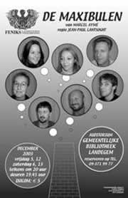 1989Les MaxibulesAffiche de la deuxième reprise au théâtre Edouard VII – Sacha Guitry. Mise en scène de Gérard Savoisien Avec : Raymond Acquaviva (Bordeur), Marc De Busschere (J.-P. Donadieu), Thierry Wermuth (Célestin), Catherine Eckerle (Y. Donadieu), Véronique Leblanc (Fl. Donadieu), Yann Bonny (L. Ambliaux), Brigitte Buc (Ernestine). Affiche de Rémy Pouthiers - 1989 |