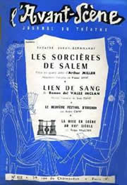 1955Les Sorcières de SalemIn : « Avant-Scène. Journal du théâtre » N°112 In-12, 40 pages, 183 x 267 mm illustré de quelques photos en noir et blanc, hors texte. Contient : Théâtre Sarah-Bernhardt, Les Sorcières de Salem, pièce en quatre actes d’Arthur Miller, adaptation française de Marcel Aymé - Lien du sang de Valle Inclan version française de Jean Camp - le neuvième festival d'Avignon par André Camp - La mise en scène au XVIe siècle par Roger Vaultier |
