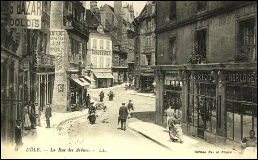 Dole : Rue des Arènes et Place de l’Ancienne Poste, où la tante Léa tient un magasin à l’enseigne du « Fuseau d’Or » au n°6 de la rue des Arènes sous les stores à gauche